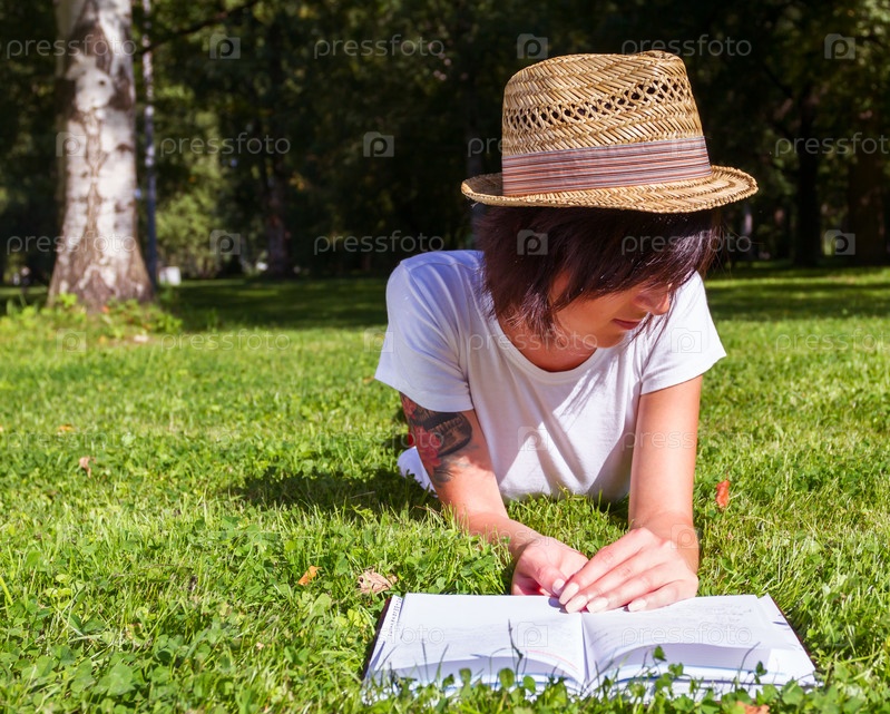 Красивая девушка лежит на лугу и читает книгу