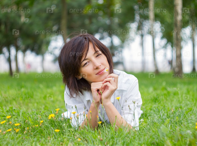 Молодая женщина, лежа на траве