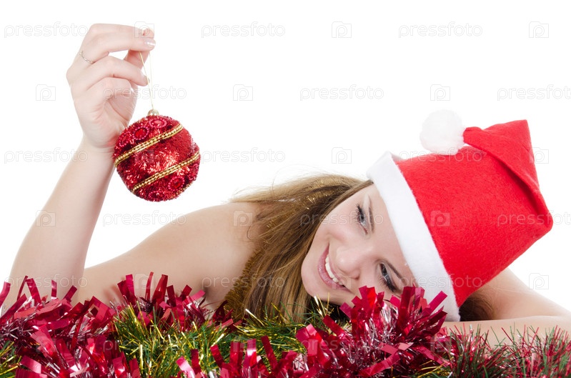 Девушка в новогодней шапке на белом фоне