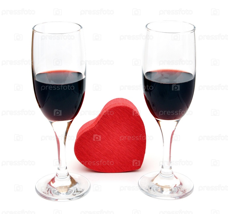 Два бокала красного вина и подарочная упаковка на белом фоне
