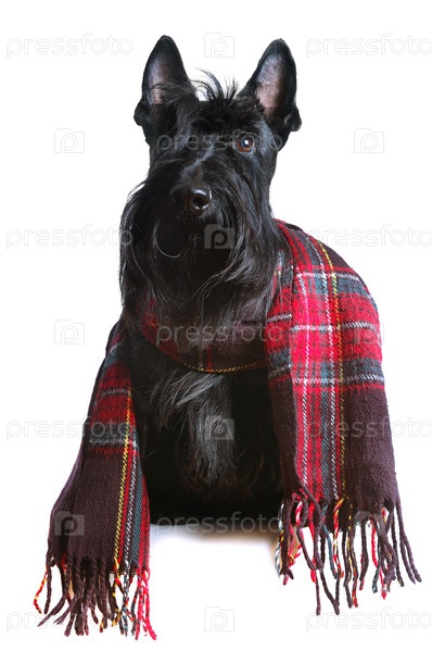 Шотландский терьер в красном шарфе на белом фоне