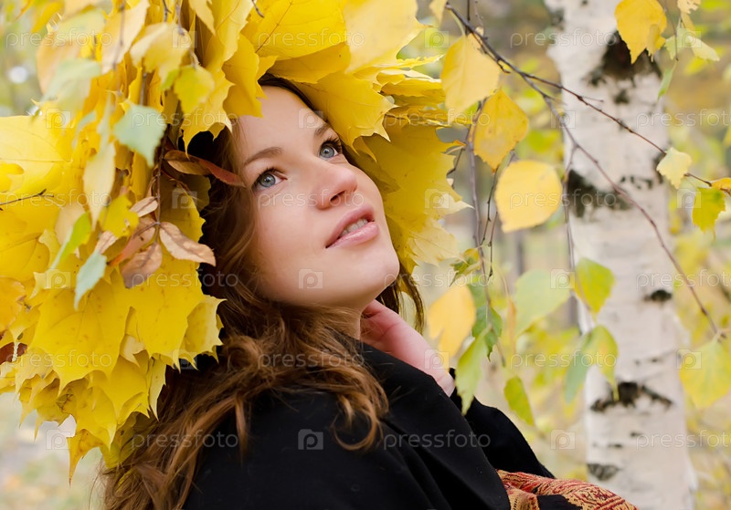 Красивая девушка с венком из кленовых листьев в осеннем парке