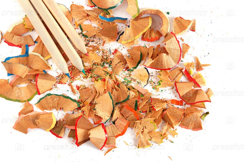 Цветные карандаши и стружка на белом фоне