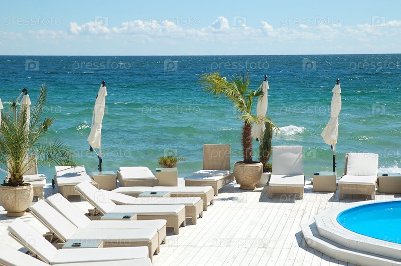 Лежаки , зонты и бассейн недалеко от моря