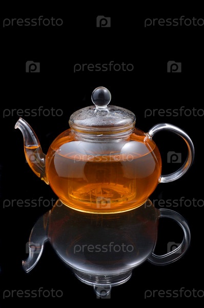 Чай в стеклянном чайнике на черном фоне