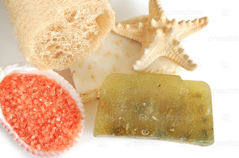 Соль для ванны, природное мыло, мочалка и морская звезда на белом фоне