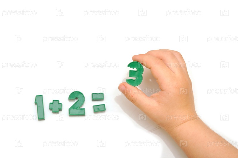Арифметический пример, выложенный из объемных цифр и знаков, рука играющего держит цифру-решение