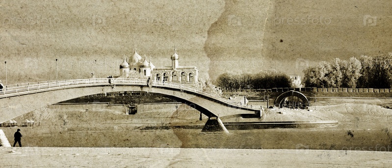 Изображение моста через реку на старом холсте