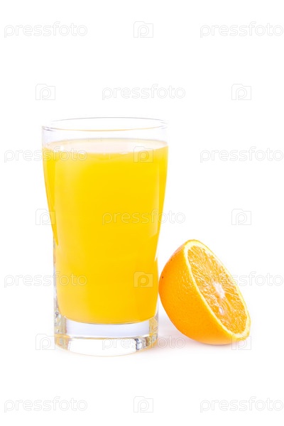 Стакан апельсинового сока и половинка апельсина, изолированные на белом фоне