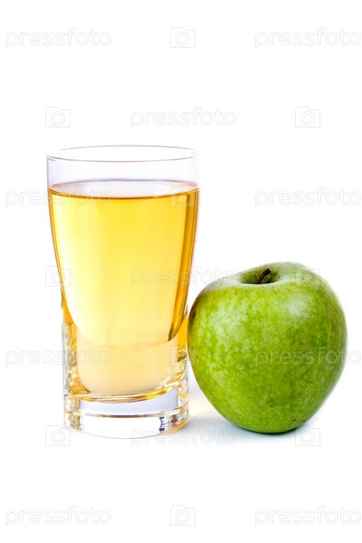 Стакан яблочного сока и яблоко, изолированные на белом фоне