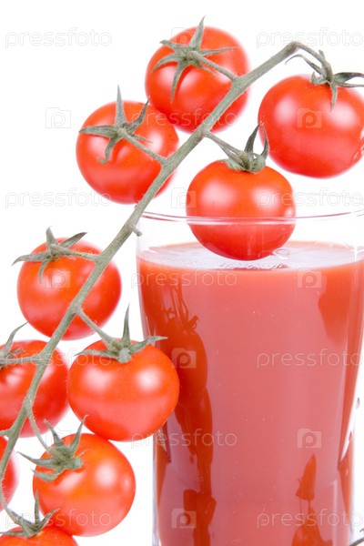 Стакан томатного сока и ветка томатов-черри, изолированные на белом фоне