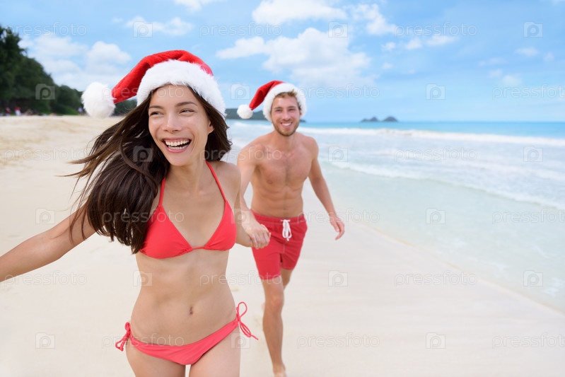 Счастливая пара Рождество весело бегают на пляже