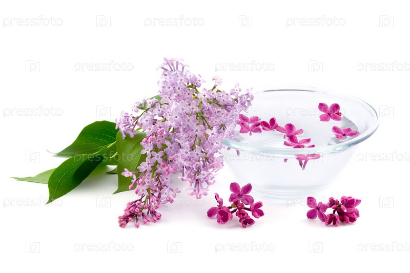 Сирень и миска воды на белом фоне