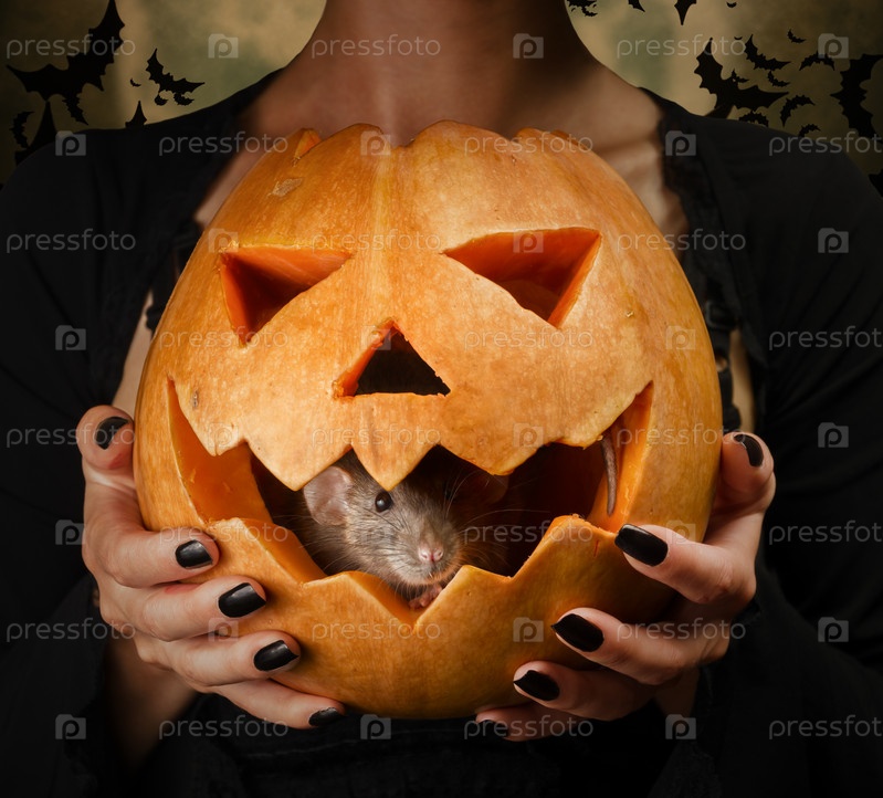 Серая крыса сидит в резные тыквы