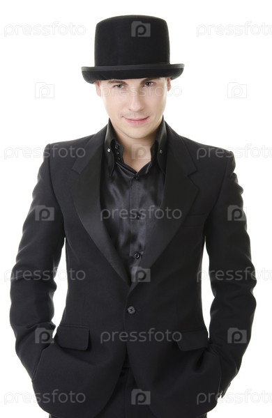 Улыбающийся молодой человек в черном костюме и шляпе