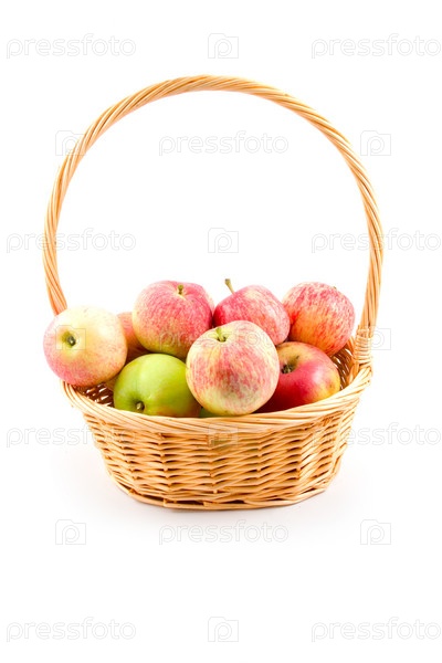 Спелые яблоки в корзине на белом фоне