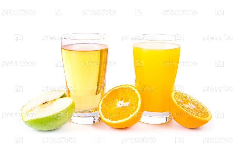 Стаканы апельсинового, яблочного сока и половинки яблока и апельсина, изолированные на белом фоне