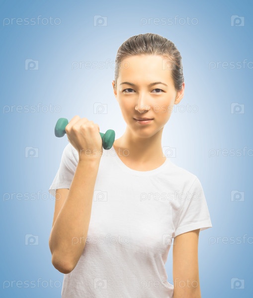 Улыбается женщина с гантелей