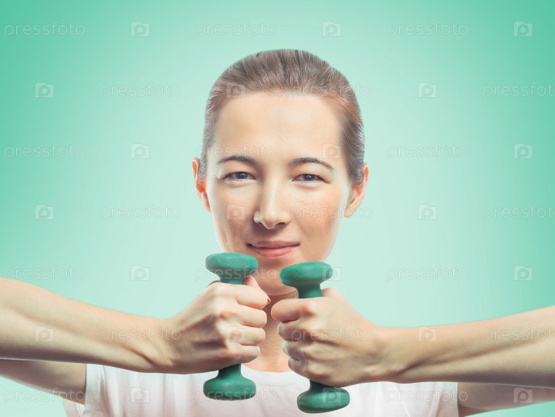 Счастливая женщина проводит две гантели