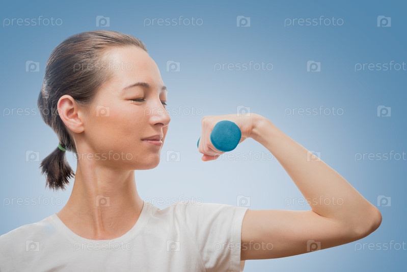 Счастливая женщина с гантелями