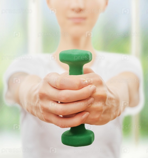 Женщина держит один зеленый Гантель
