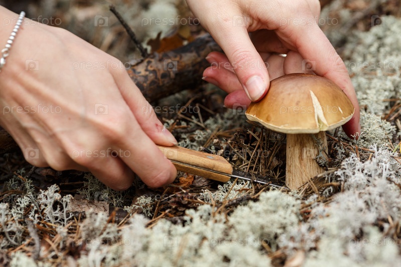 Женщина срезает гриб