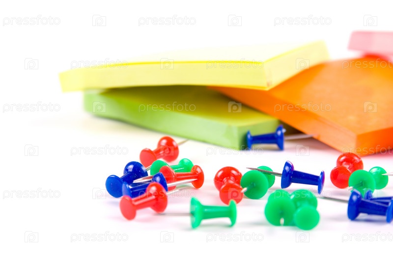 Стикеры и канцелярские кнопки на белом фоне