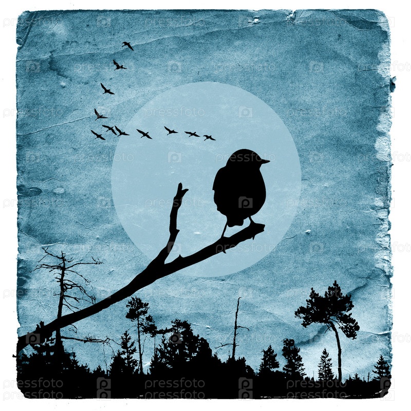 Изображение птицы на ветке на старом холсте