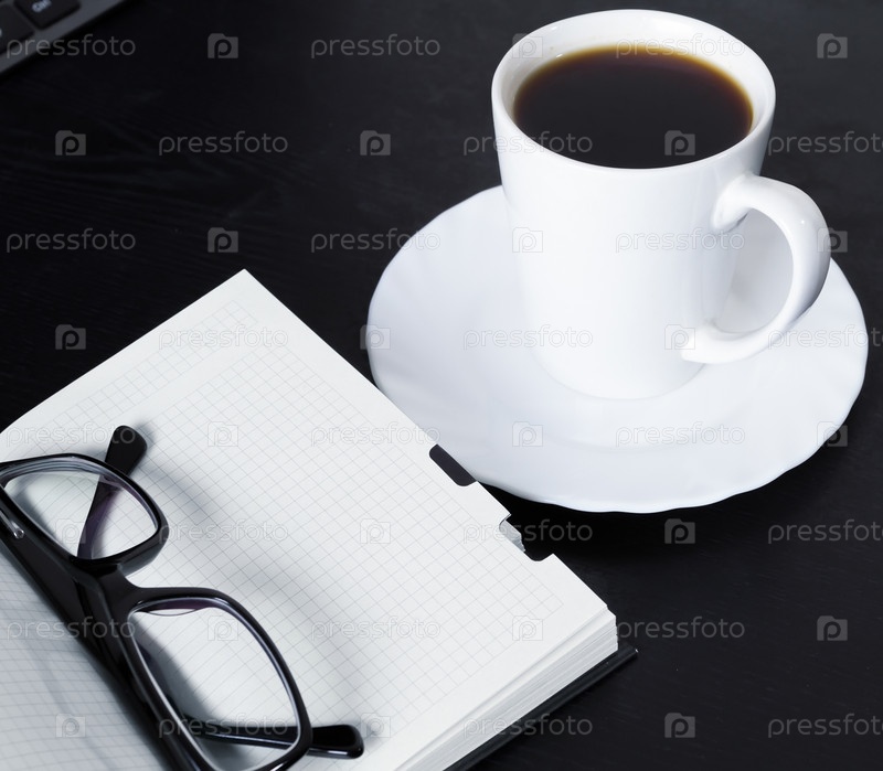 Открытая книга с чашкой на офисном столе