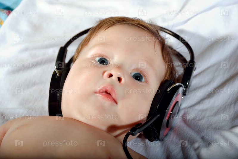 Маленький ребенок слушает музыку в наушниках