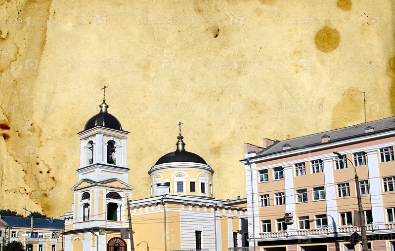 Старинные здания на фоне старой выветрившейся бумаги