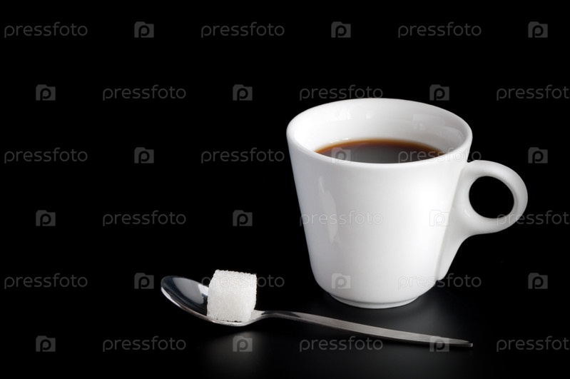 Чашка темного крепкого кофе, сахар и ложка на черном фоне