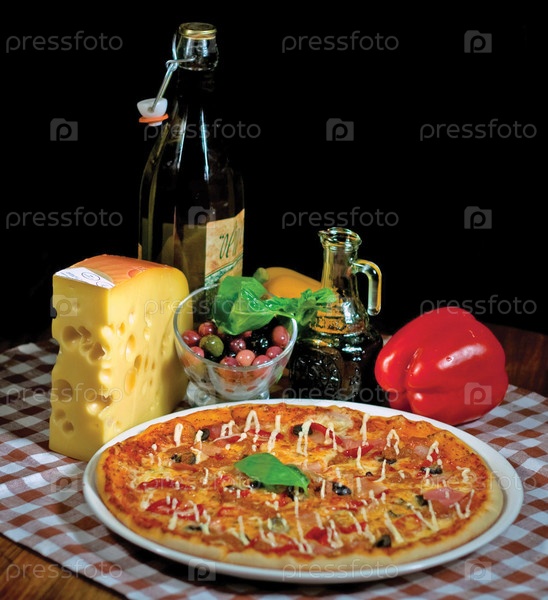 Натюрморт с пиццей и продуктами для ее изготовления