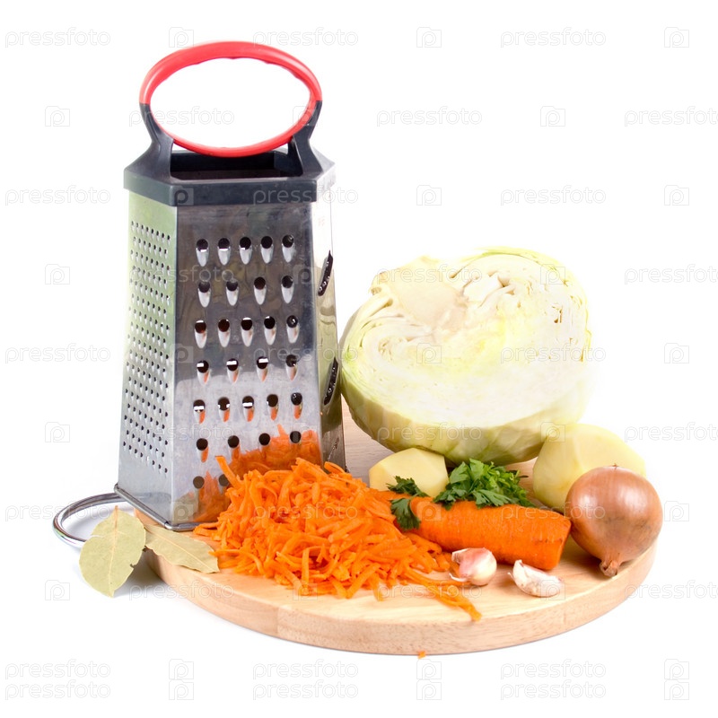 Свежие овощи для приготовления супа и терка на разделочной доске