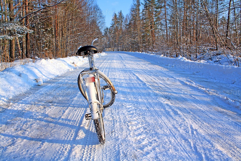 Велосипед на дороге в зимнем лесу