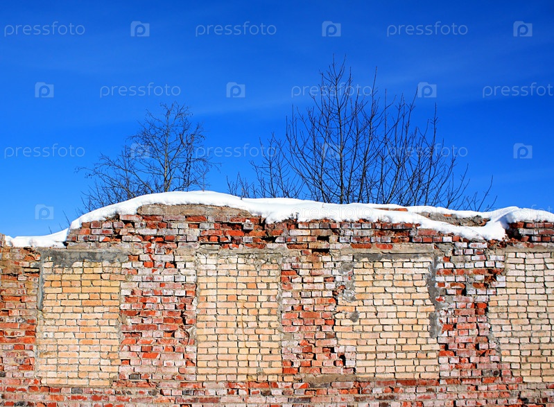 Стена старого разрушенного здания в снегу