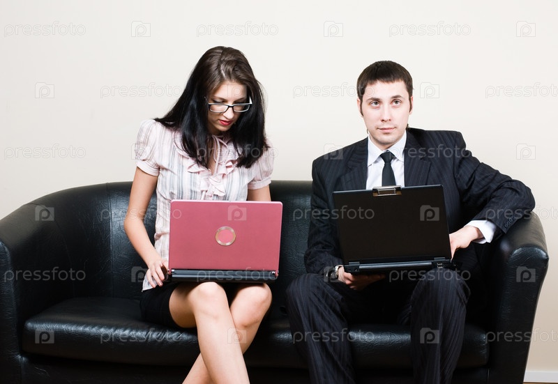 Молодые бизнесмены, работающие на ноутбуке в офисе