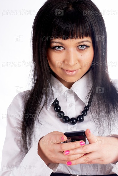 Молодая женщина набирает текстовое сообщение на мобильном телефоне