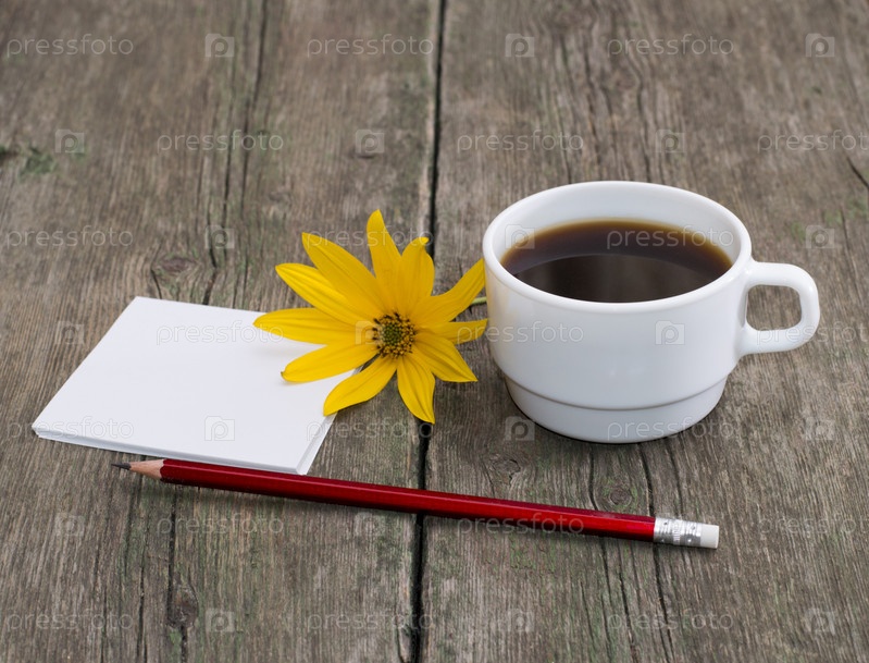Чашка кофе, карандаш с бумагой и желтый цветок