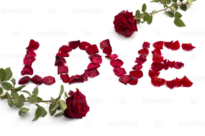 Надпись любви из лепестков роз, и две розы сверху и снизу