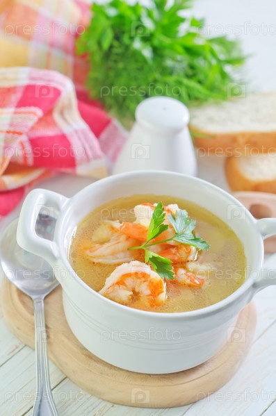 Свежий суп с курицей и креветками