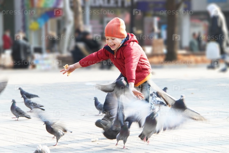 Маленький мальчик гоняет голубей на улице