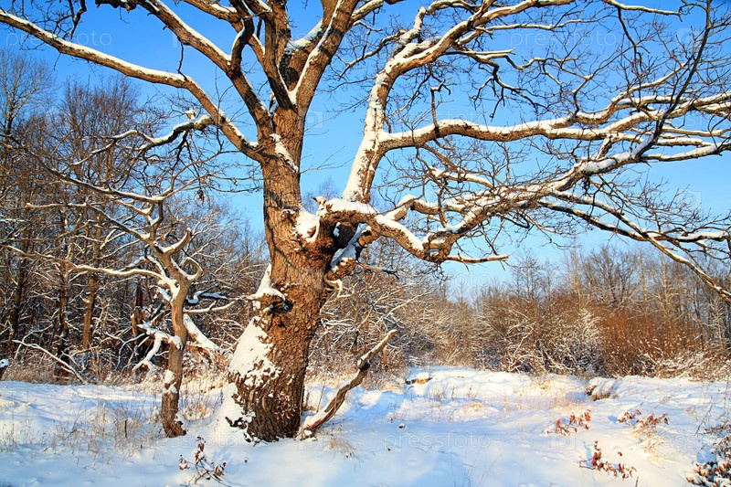 Дуб в снегу. Зимний пейзаж