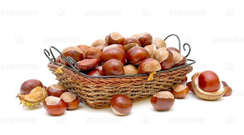 Каштаны в плетенной корзинке крупным планом на белом фоне