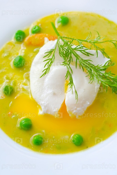 Свежий суп из зеленого горошка и яйца пашот