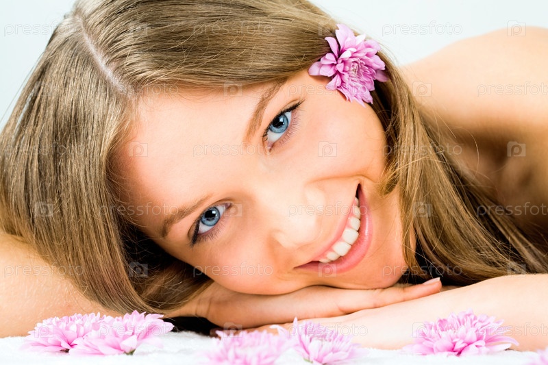 Портрет молодой свежей улыбающейся девушки, лежащей на полотенце с цветами рядом и в волосах и смотрящей на камеру