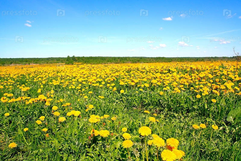 Поле желтых одуванчиков под голубым небом