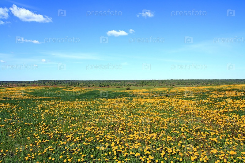 Поле желтых одуванчиков под голубым небом