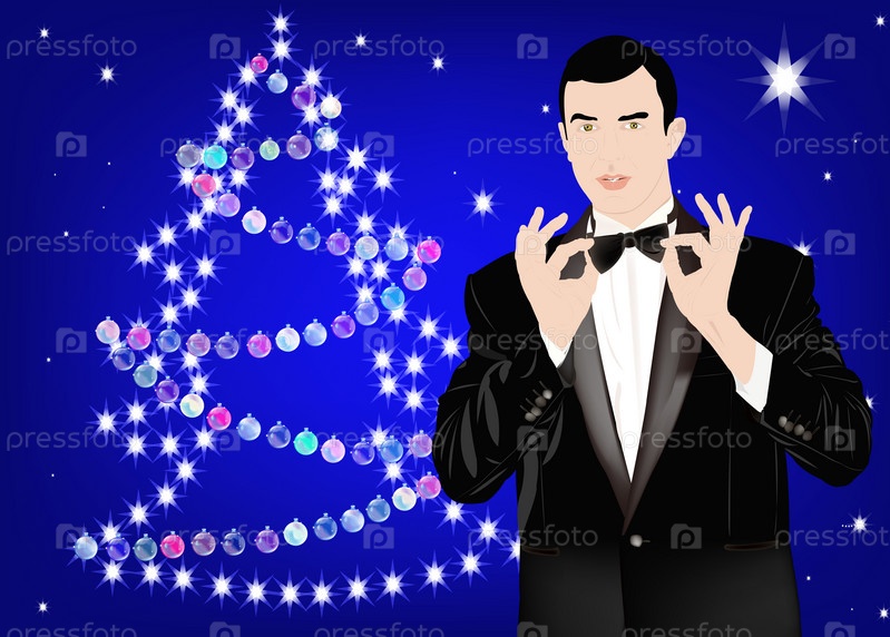 Мужчина в классическом смокинге на новогоднем фоне