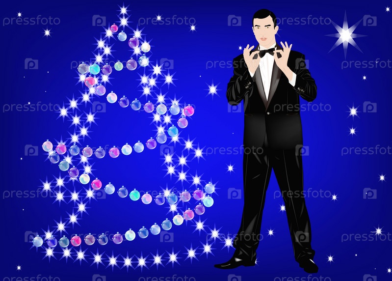 Мужчина в классическом смокинге на новогоднем фоне